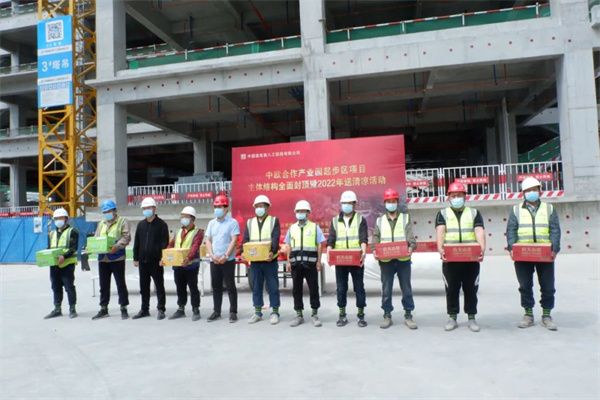 作为市级重点工程项目,中欧合作产业园起步区项目自进场以来,公司始终坚持高标准、严要求,一手抓疫情防控,采取工人从宿舍到工地的闭环管理,为降低感染风险,春节期间安排大巴专车,点对点送员工平安过年;一手抓项目建设,战严寒斗酷暑,合理调配各项资源,组织工人抢抓施工黄金期,持续加强项目现场的质量和安全生产管控,在全体人员的共同努力下,实现了顺利封顶。