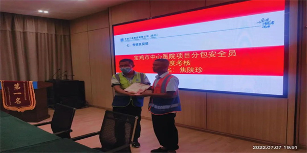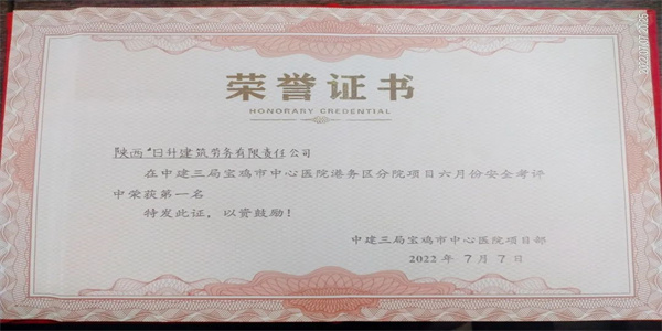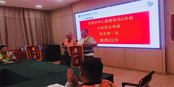 通过对项目建设中的安全管理、质量管控、安全文明施工、技术交底、生活区管理等方面工作的检查和评比,陕西日升建筑劳务有限责任公司宝鸡市中心医院港务区分院项目部荣获表彰。