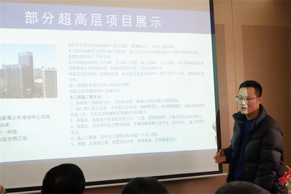 总经理宋管理和项目经理习鑫分别就公司近三年承建的部分公建类项目、商业综合体类项目、住宅类项目以及超高层项目进行了重点介绍和详细讲解。