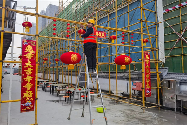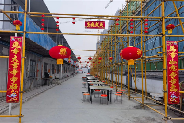 玉兔迎新,万象更新,1月21日,农历大年三十,在这个万家团圆、举国欢庆的日子,为保障工程建设进度臻诚实业集团多个项目不停工,建设者们毅然选择坚守岗位一线,为了让大家在项目上也能过好年公司精心安排了项目团圆饭,现在,小编带您一起走进菁英公寓公租房项目的年夜饭现场,大家贴对联、挂灯笼、包饺子、拜新年……在红红火火的氛围里,体验不一样的年味,感受家一样的温暖。